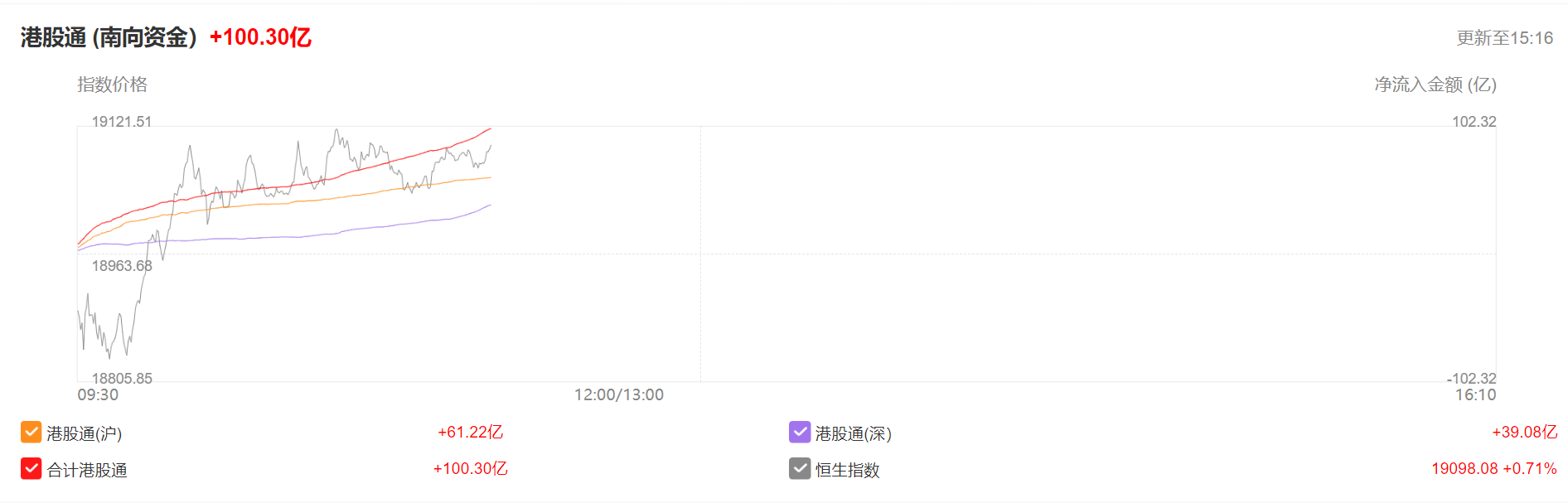 财联社5月13日电,截至发稿,南向资金净流入超100亿港元,其中,港股通(沪)净流入超61亿港元,港股通(深)净流入超38亿港元。