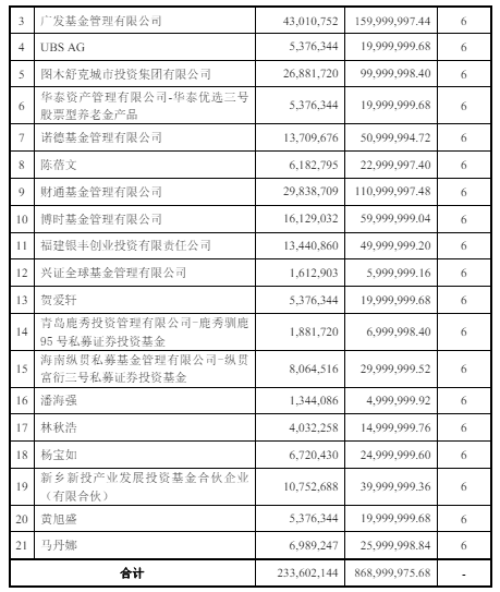 财联社5月13日电,新乡化纤公布向特定对象发行股票发行情况报告书,本次发行的发行数量为233,602,144股,发行底价为3.72元/股,本次发行募集资金总额为人民币约8.69亿元。本次发行对象最终确定为21名,具体配售结果如下。