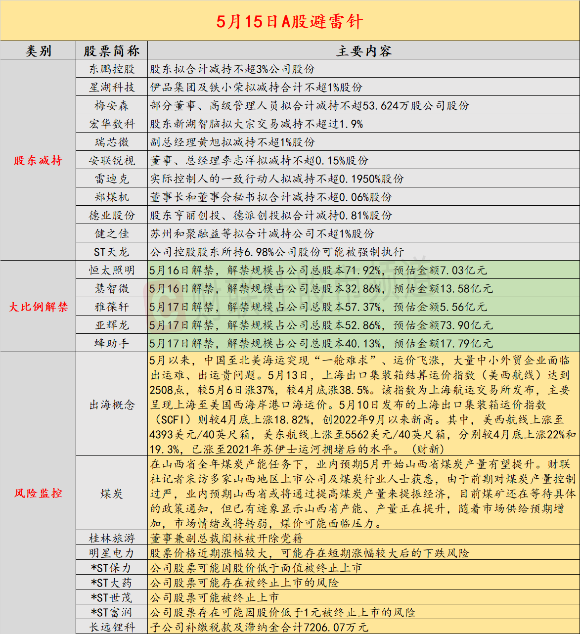 昨日公告的A股拟减持的公司数量较之前有所增多,东鹏控股股东拟合计减持不超3%公司股份;慧智微、亚辉龙将迎来超三成以上解禁;光大、华西、东吴、国海四家券商接罚单,事涉金通灵财务造假;3连板明星电力公告,股票价格近期涨幅较大,可能存在短期涨幅较大后的下跌风险;山西煤炭增产预期升温,煤价反弹或受压制;桂林旅游董事兼副总裁訚林被开除党籍;热门中概股多数下跌,阿里巴巴跌超6%。