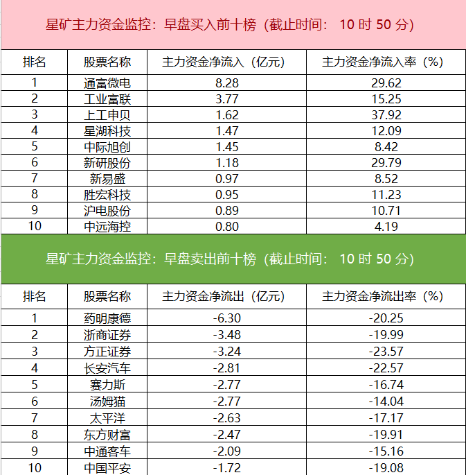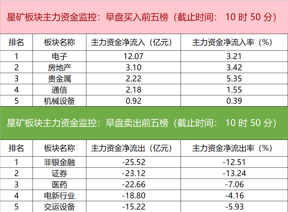 财联社5月15日电,财联社星矿数据显示,今日早盘主力资金净流入电子、房地产、贵金属等板块,净流出非银金融、证券、医药等板块,其中非银金融板块净流出超25亿元。个股方面,通富微电大涨,主力资金净买入8.28亿元位居首位,工业富联、上工申贝、星湖科技获主力资金净流入居前;药明康德遭净卖出超6亿元,浙商证券、方正证券、长安汽车主力资金净流出额居前。