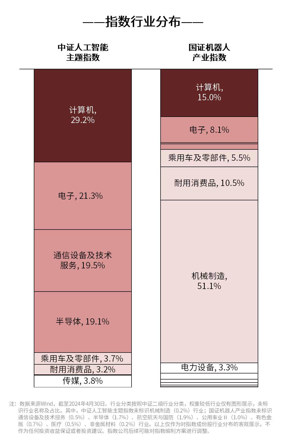 中证人工智能主题指数聚焦人工智能产业链各细分环节龙头;国证机器人产业指数聚焦人工智能硬件终端,机械制造、计算机行业占比较高。人工智能ETF(159819)、机器人100ETF(159530)等跟踪相关指数的产品,配置价值受到市场关注。