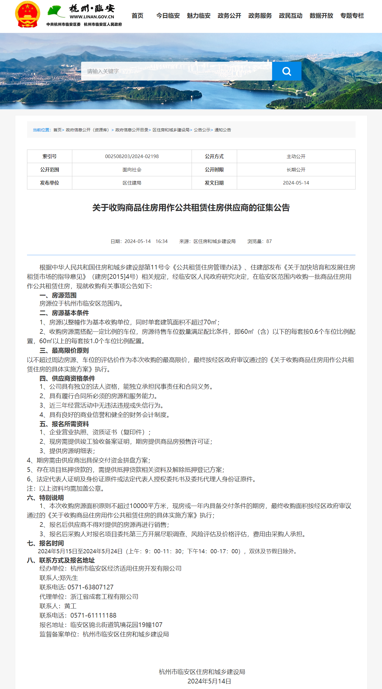 财联社5月15日电,杭州市临安区住房和城乡建设局日前发布公告,经临安区人民政府研究决定,在临安区范围内收购一批商品住房用作公共租赁住房。房源要求位于杭州市临安区范围内。房源基本条件如下:①房源以整幢作为基本收购单位,同时单套建筑面积不超过70㎡;②收购房源需搭配一定比例的车位,房源待售车位数量满足配比条件,即60㎡(含)以下的每套按0.6个车位比例配置,60㎡以上的每套按1.0个车位比例配置。