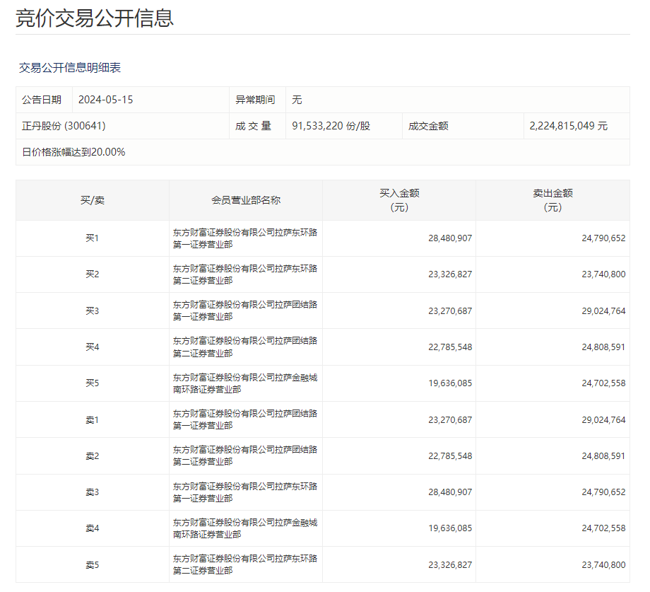 财联社5月15日电,正丹股份今日涨停,成交额22.25亿元,换手率18.02%。龙虎榜数据显示,买入前五和卖出前五席位均为东方财富拉萨营业部。其中,东方财富拉萨东环路第一证券营业部买入2848万元并卖出2479万元,东方财富拉萨团结路第一证券营业部买入2327万元并卖出2902万元。