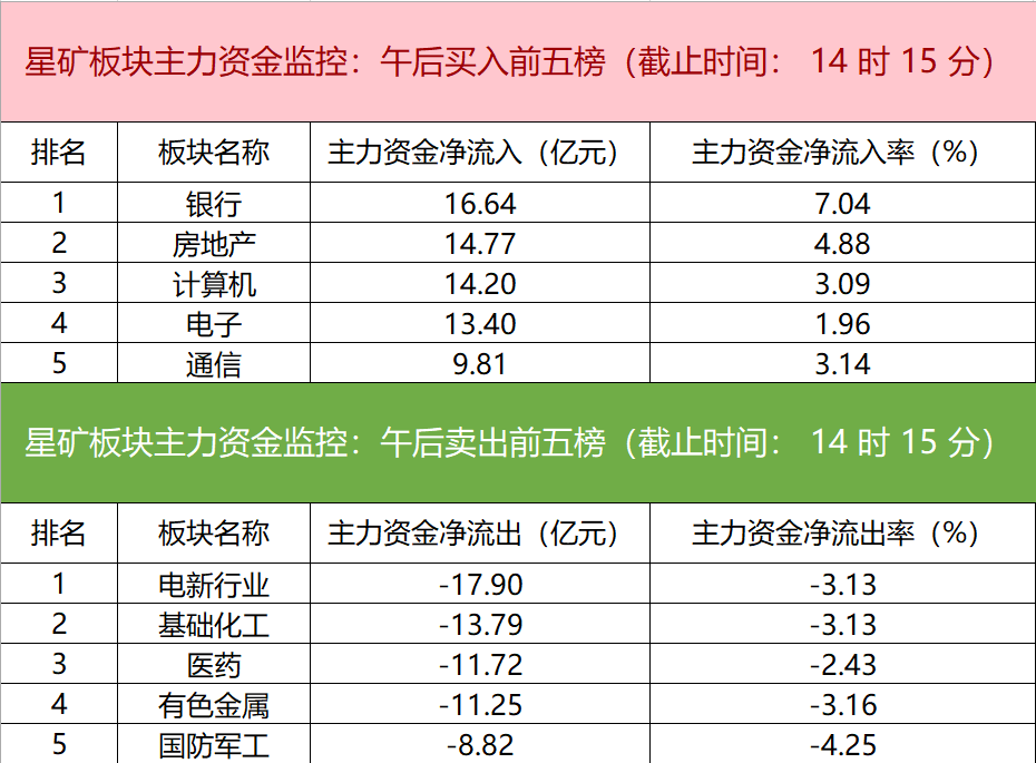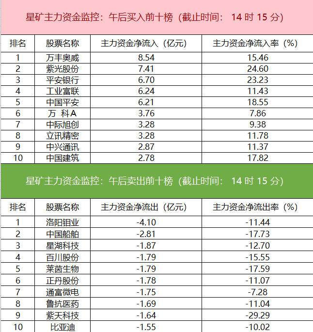 财联社5月16日电,财联社星矿数据显示,今日主力资金净流入银行、房地产、计算机等板块,净流出电新行业、基础化工、医药等板块,其中电新行业净流出17.90亿元。个股方面,万丰奥威大涨,主力资金净买入8.54亿元居首位,紫光股份、平安银行、工业富联获主力资金净流入居前;洛阳钼业遭净卖出4.10亿元居净流出首位,中国船舶、星湖科技、百川股份等主力资金净流出额居前。