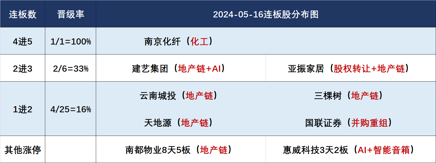 今日共41股涨停,连板股总数7只,其中三连板及以上个股3只,上一交易日共7只连板股,连板股晋级率42.85%(不含ST股、退市股及未开板新股)。个股方面,南京化纤虽然晋级5连板,但盘中9次开板,表明分歧巨大。连板风格持续萎靡,声迅股份跌停,积成电子再度跌超8%,昨2连板万里股份、北化股份跌超7%。板块方面,受昨夜美股英伟达大涨带动,AI硬件端早盘异动,工业富联一度涨超8%,高速连接器概念的创益通20CM涨停,神宇股份涨超15%;地产产业链盘中继续走强,南都物业8天5板、天地源5天3板,午后炒作情绪扩散,志邦家居、江山欧派、蒙娜丽莎等家居股也一度封板,不过受限于市场情绪低迷,板块再度回落。