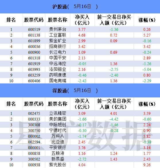 财联社5月16日电,北向资金今日大幅净买入60.67亿元。工业富联、紫光股份、平安银行分别获净买入4.68亿元、4.04亿元、3.76亿元。新易盛净卖出额居首,金额为2.72亿元。