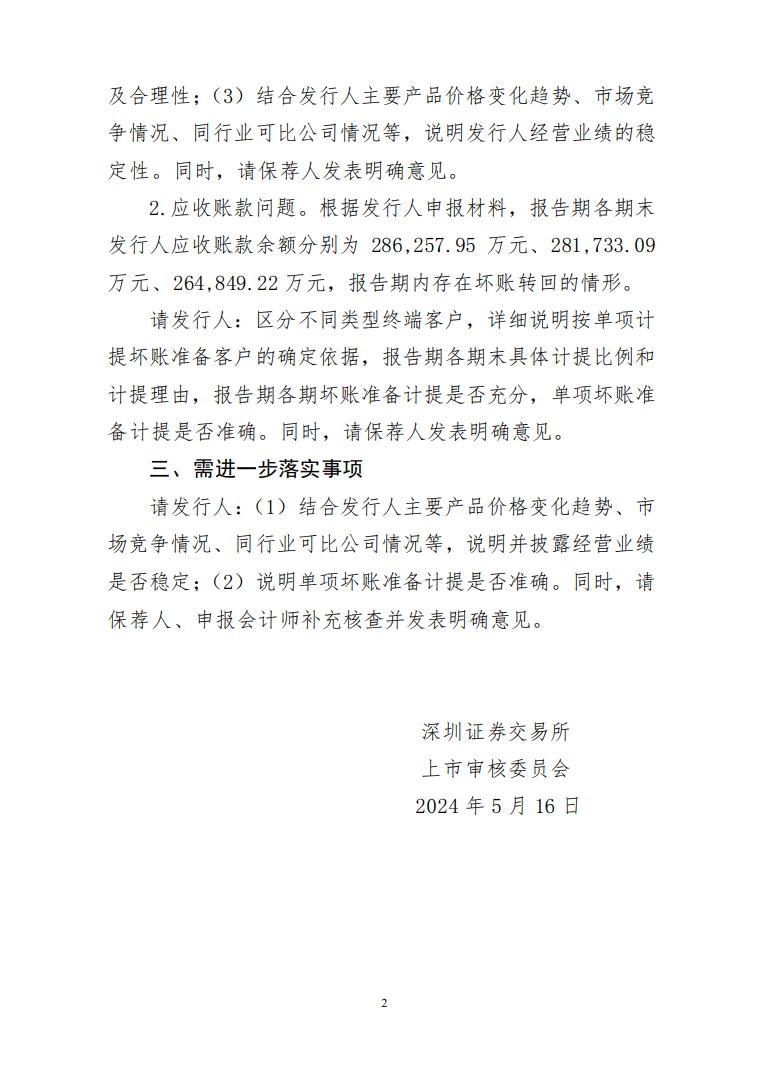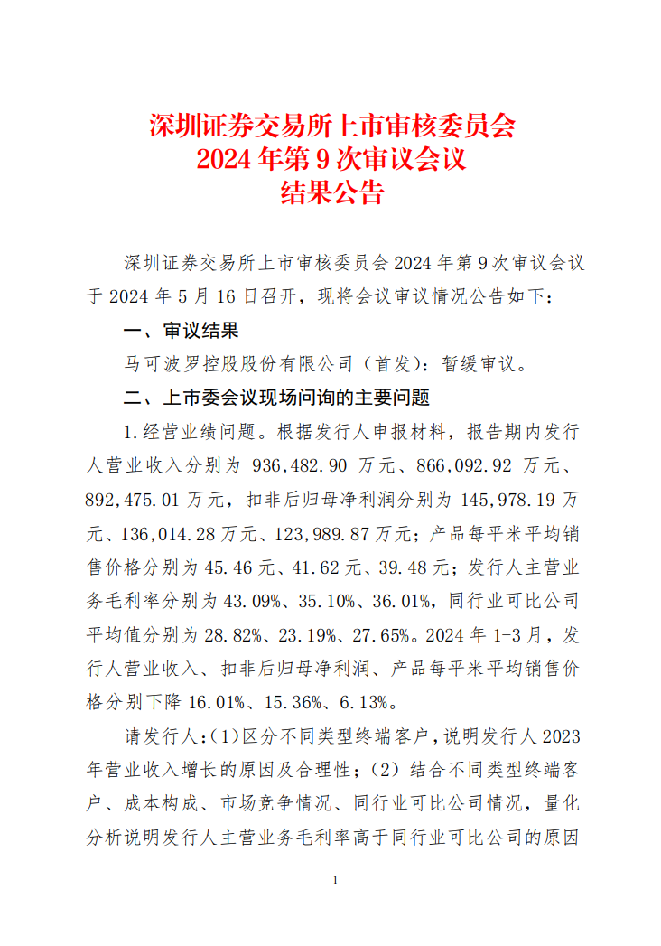 财联社5月16日电,深交所暂缓审议马可波罗控股股份有限公司首发申请,要求发行人结合发行人主要产品价格变化趋势、市场竞争情况、同行业可比公司情况等,说明并披露经营业绩是否稳定;说明单项坏账准备计提是否准确。同时,请保荐人、申报会计师补充核查并发表明确意见。