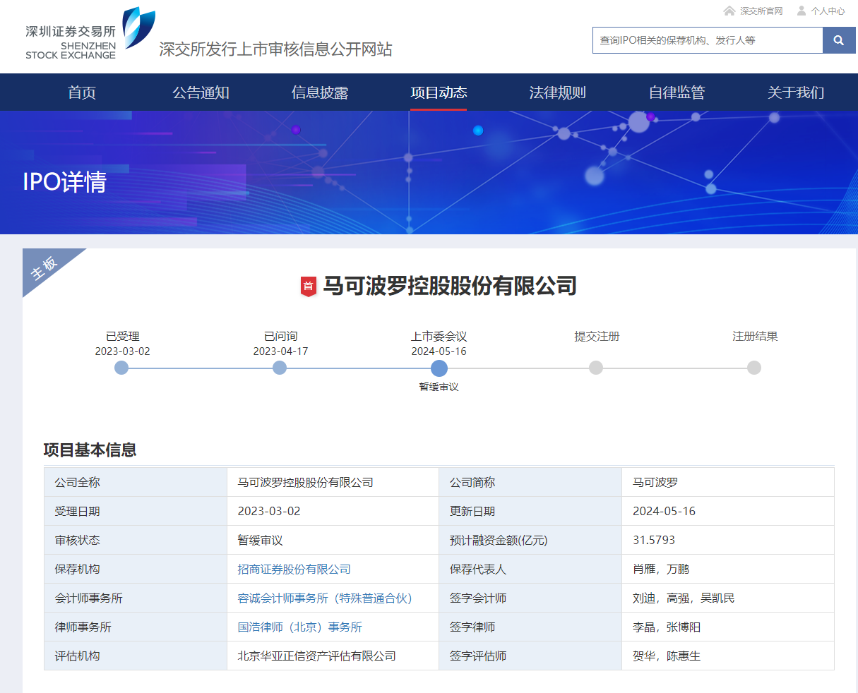 深交所暂缓审议马可波罗控股股份有限公司首发申请