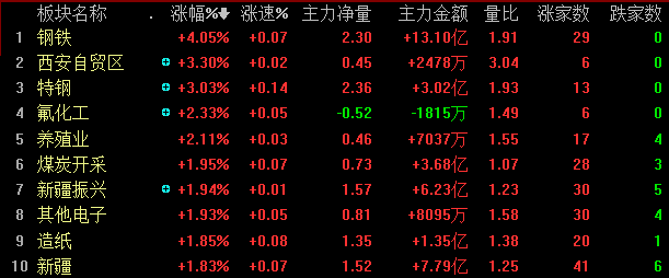 今天虽然大盘涨幅并不大,但是以题材股为代表的创业板上涨近1%,带动各个板块走强。钢铁板块成为今天的上涨主力,大涨逾4%;西安自贸区、特钢板块紧随其后,均大涨3%;氟化工、养殖业板块则上涨2%以上;煤炭、新疆振兴、造纸等板块亦有不同程度的上涨。