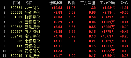 钢铁股今天集体爆发,虽然未出现涨停潮的现象,但对大盘的拉升作用极为重要。八一钢铁、马钢股份强势涨停,柳钢股份暴涨8%,首钢股份、新钢股份、方大特钢均大涨5%以上,常宝股份、南钢股份、韶钢松山、安阳钢铁、宝钢股份等个股亦有不同程度的上涨。