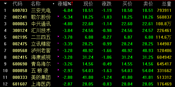 以沪深300标的股为代表的蓝筹白马股今天出现回调行情,尤其是前期的龙头个股领跌。三安光电、歌尔股份均大跌5%以上,中兴通讯、汇川技术、二三四五、立讯精密、泸州老窖、海康威视、青岛海尔的跌幅均超过3%,美的集团、五粮液、上海医药等个股亦有不同程度的下跌。从沪深300指数的走势来看,连续五个交易日在3650点附近进行震荡整固,相信不久就会做出方向的选择。从沪深300标的股的走势来看,已有较多前期强势龙头股出现一根大阴线的下跌,若未来短期内不能快速收复大阴线,那么这些前期强势的龙头个股大概率将拐头向下,进入下降趋势,进而影响到整个指数的走势。