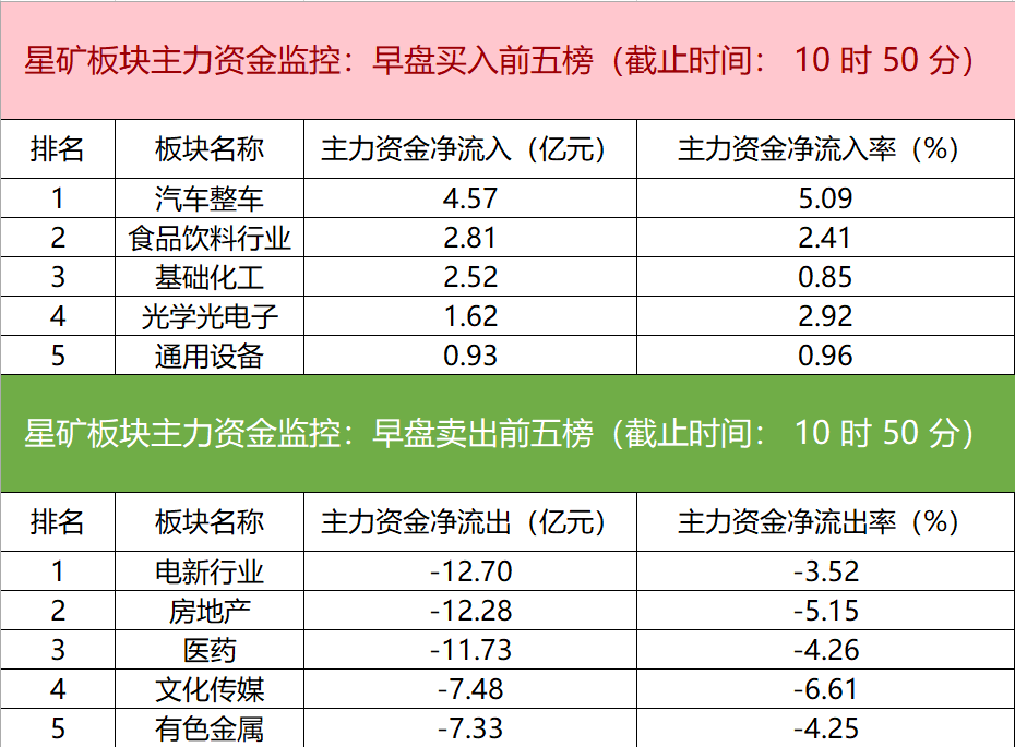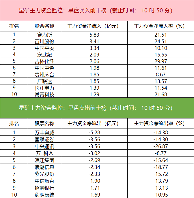财联社5月17日电,财联社星矿数据显示,今日早盘主力资金净流入汽车整车、食品饮料行业、基础化工等板块,净流出电新行业、房地产、医药等板块,其中电新行业净流出超12亿元。个股方面,赛力斯上涨,主力资金净买入5.83亿元位居首位,百川股份、中国平安、寒武纪获主力资金净流入居前;万丰奥威遭净卖出超5亿元,国联证券、中兴通讯、万科A主力资金净流出额居前。