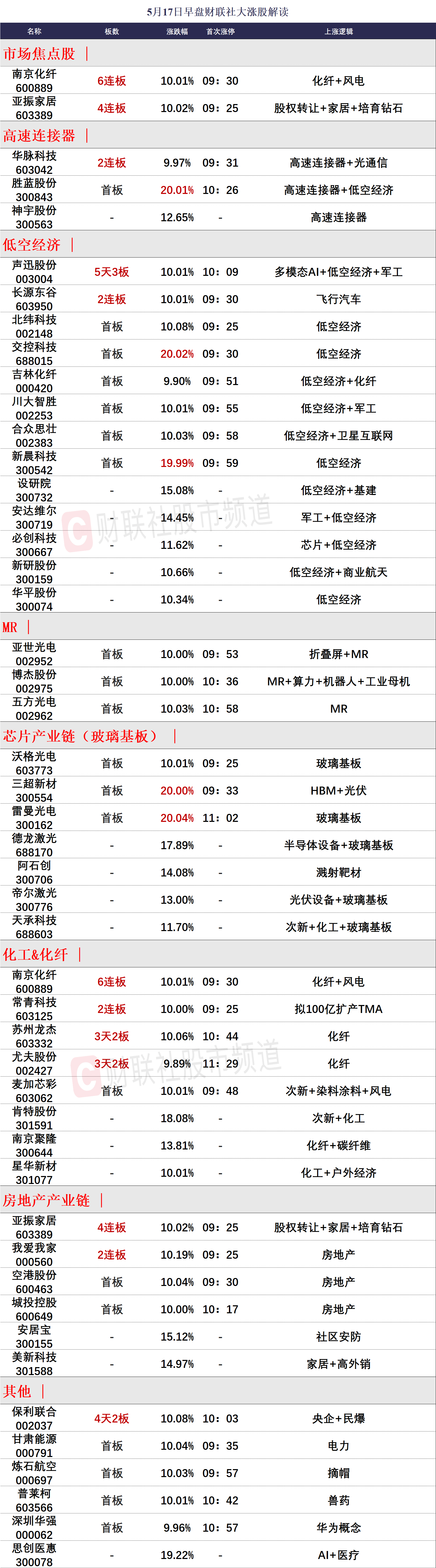 财联社5月17日电,今日午盘两市共30涨停,连板股总数6只,21股封板未遂,封板率为59%(不含ST股、退市股及未开板新股)。焦点股方面,化工板块南京化纤6连板,地产链的亚振家居一字涨停晋级4连板。
