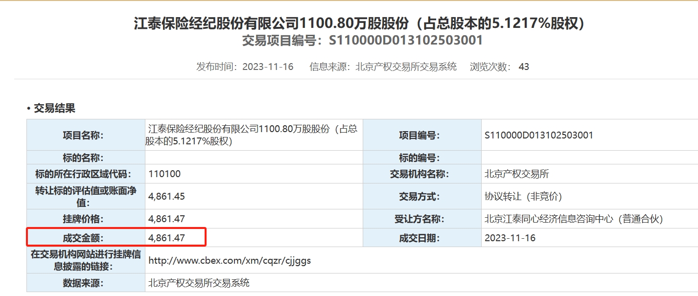 不过,当财联社记者查阅北京市公共资源交易服务平台发现,有关于江泰保险经纪1100.80万股股份(占总股本的5.1217%)的项目在2023年11月16日已成交,成交价格为4,861.47万元,折合每股约4.42元。同时,记者还在发现,中煤集团曾于2023年8月9日在该平台挂牌该股权,挂牌价格正是4861.47万元。