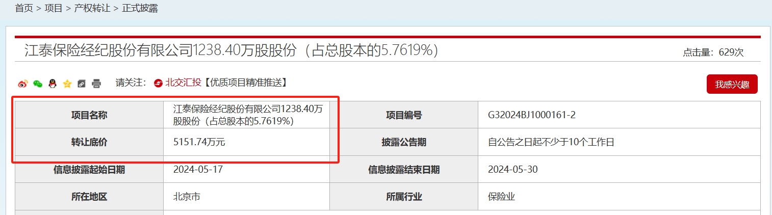 5月17日,北京产权交易所网站显示,江泰保险经纪股份有限公司(简称“江泰保险经纪”)1238.40万股股份(占总股本的5.7619%)再次被上架挂牌转让。股权转让方为中化资本有限公司(简称“中化资本”)。此次信息披露起始日期为2024年5月17日。