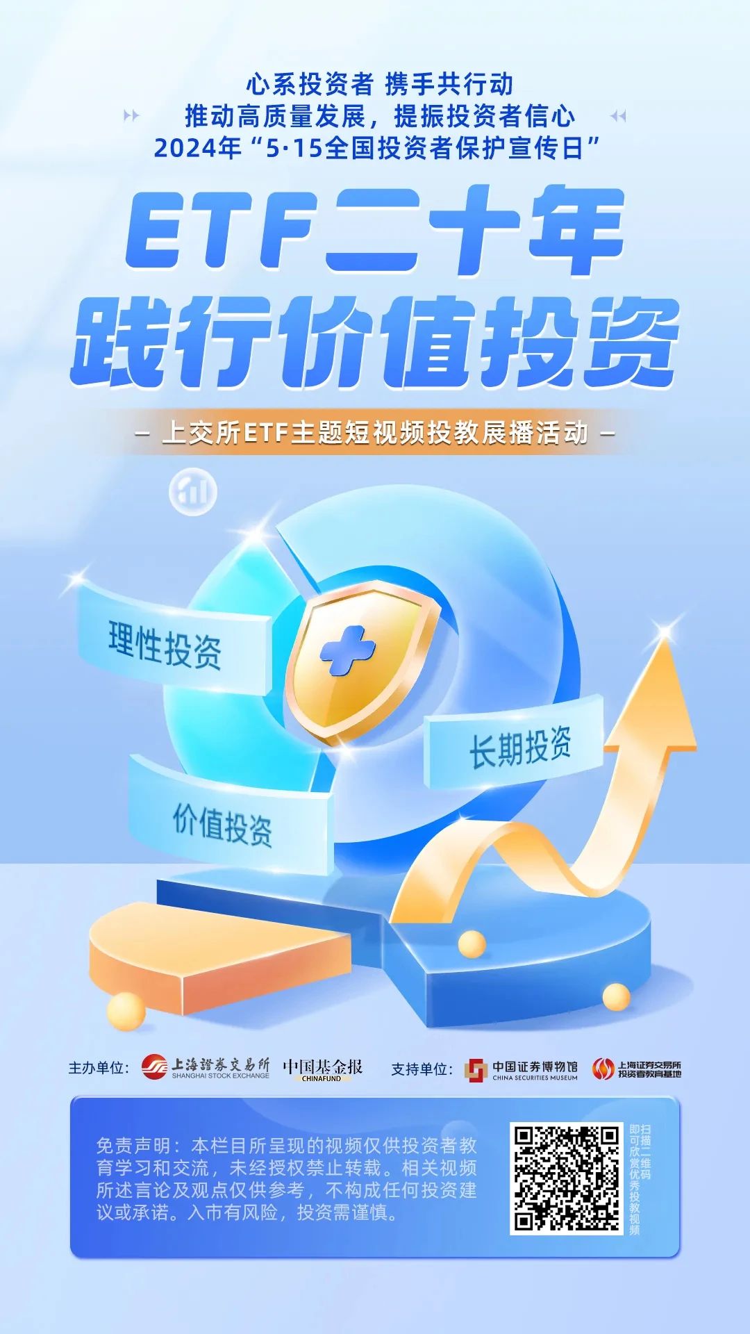 恰逢2024年是境内ETF市场成立二十年,为更好推进投资端改革,加大指数化投资方式普及力度,上海证券交易所联合中国基金报于“5•15全国投资者保护宣传日”活动期间,组织开展ETF短视频投教展播活动。
