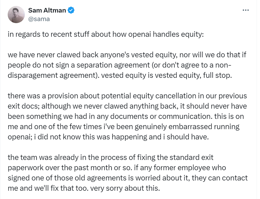 ▍OpenAI回应“封嘴”离职条款:从未回收过任何员工股权