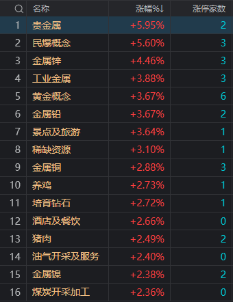 财联社5月20日电,市场早盘冲高回落,三大指数均小幅上涨。盘面上,周期股集体走强,其中贵金属、有色方向领涨,晓程科技、湖南白银、北方铜业、盛达资源涨停;电力股盘中拉升,广安爱众涨停。民爆概念股持续活跃,高争民爆、保利联合涨停。旅游股盘中拉升,长白山涨停。房地产板块分化调整,城投控股、城建发展、荣盛发展涨停。下跌方面,铜缆高速连接概念股陷入调整,神宇股份跌超5%。总体上个股上涨和下跌家数基本相当。沪深两市半日成交额6546亿,较上个交易日放量1421亿。板块方面,贵金属、民爆概念、旅游、猪肉等板块涨幅居前,铜缆高速连接、家用轻工、小家电、纺织等板块跌幅居前。截至收盘,沪指涨0.38%,深成指涨0.1%,创业板指涨0.21%。
