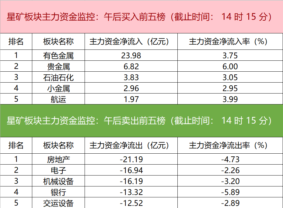 财联社5月20日电,财联社星矿数据显示,今日主力资金净流入有色金属、贵金属、石油石化等板块,净流出房地产、电子、机械设备等板块,其中有色金属板块净流入23.98亿元。个股方面,长江电力上涨,主力资金净买入3.44亿元居首位,中国铝业、新易盛、光迅科技获主力资金净流入居前;招商银行遭净卖出4.48亿元居净流出首位,中兴通讯、万科A、滨江集团等主力资金净流出额居前。