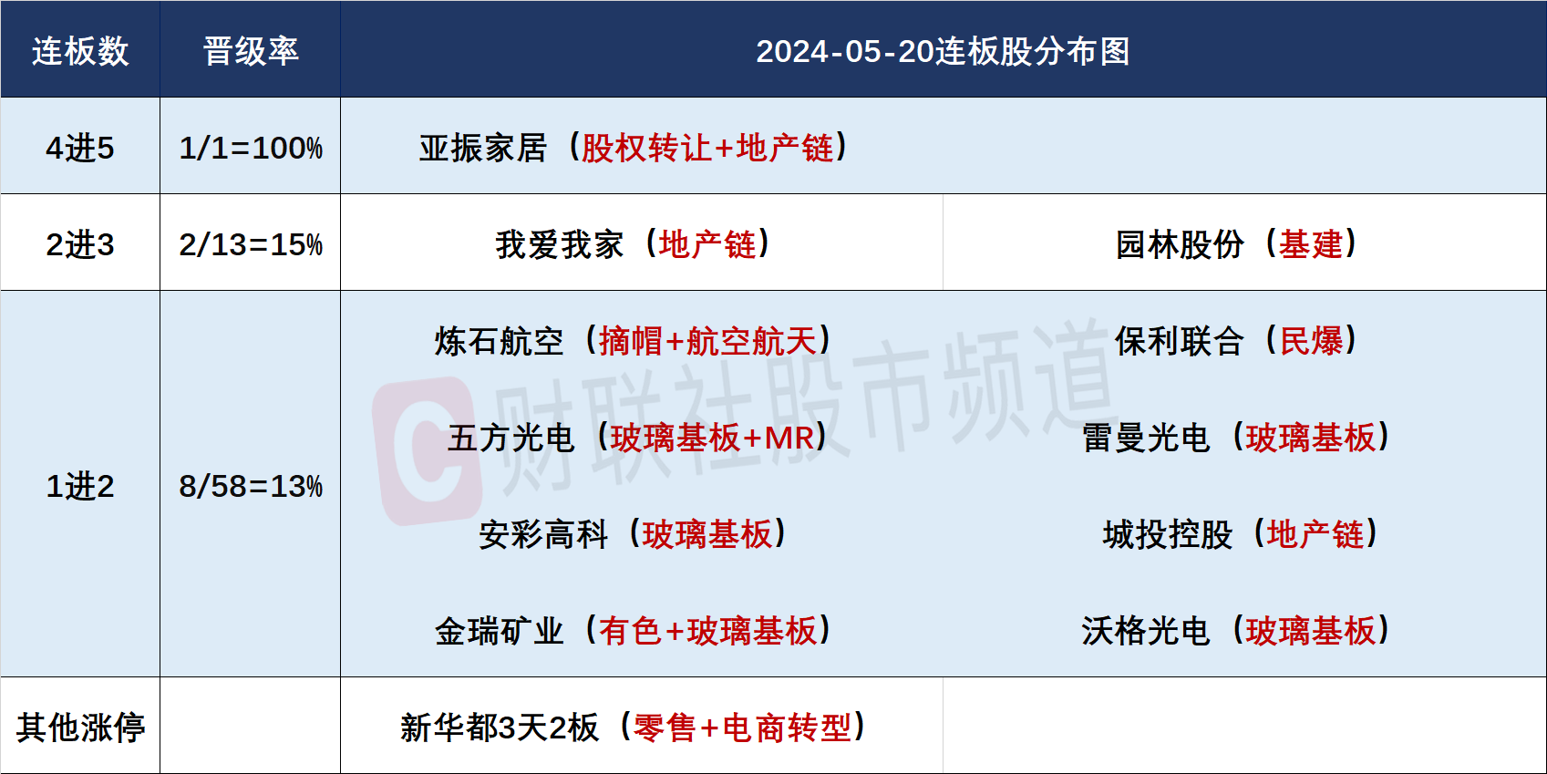 今日共42股涨停,连板股总数11只,其中三连板及以上个股3只,上一交易日共17只连板股,连板股晋级率17.64%(不含ST股、退市股及未开板新股)。午后市场风险偏好下降,地产股拉升后缺少资金接力,金地集团大幅回落,荣盛发展炸板,此外高度板南京化纤午后上演“天地板”。板块方面,以黄金、铜为首的顺周期资源股全天保持强势,湖南白银、北方铜业、晓程科技等个股涨停,上周五国际大宗商品集体大涨,黄金上涨1.11%,再次站上2400美元/盎司,为4月19日以来新高;白银大涨6.36%,为2013年以来最高;伦铜创历史新高。周末遭“辟谣”的玻璃基板概念继续上涨,超出市场预期,沃格光电、金瑞矿业一字涨停,五方光电、雷曼光电、安彩高科尾盘回封晋级2板。