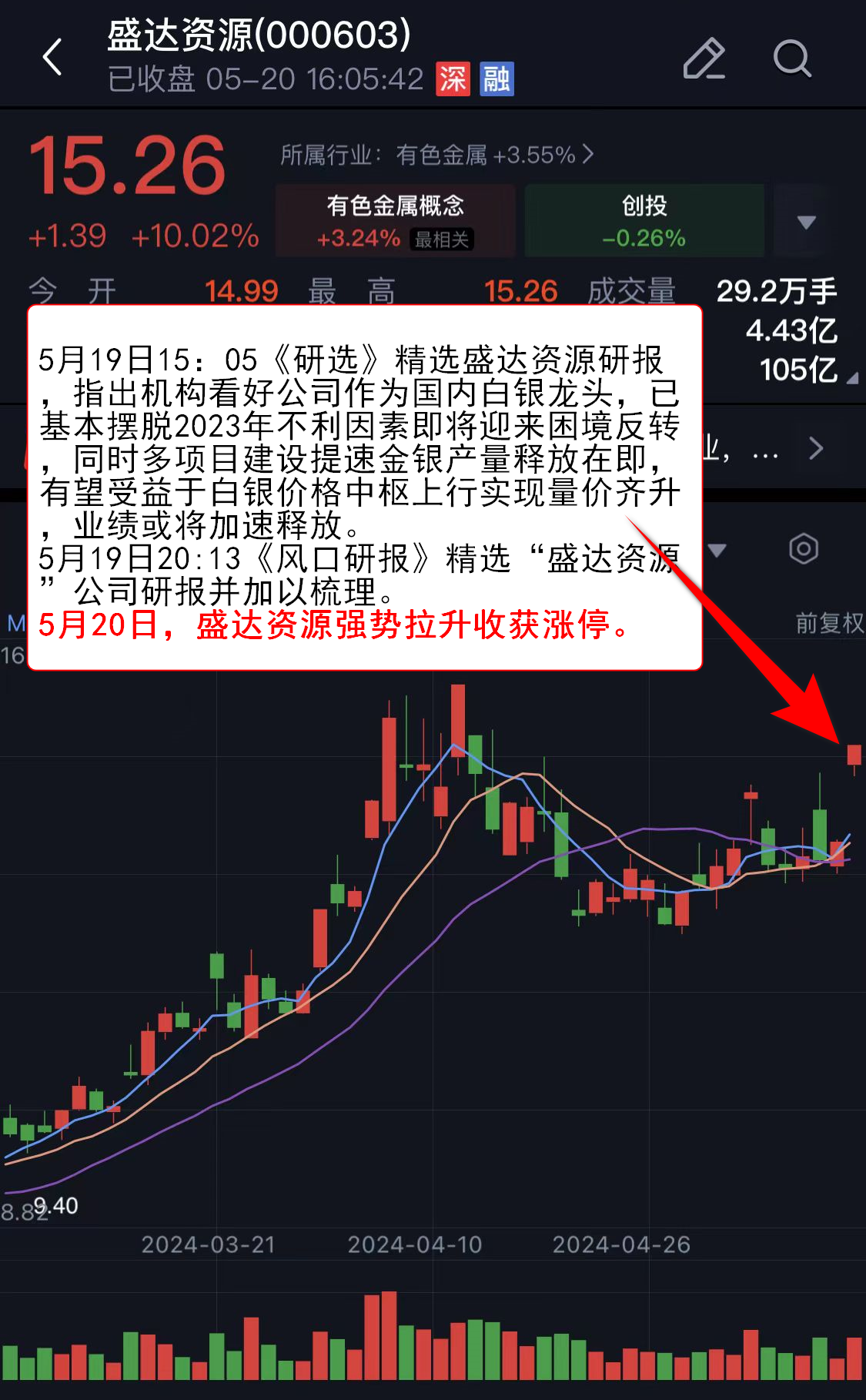 5月19日15:05《研选》 精选盛达资源研报 ,指出机构看好公司作为国内白银龙头,已基本摆脱2023年不利因素即将迎来困境反转,同时多项目建设提速金银产量释放在即,有望受益于白银价格中枢上行实现量价齐升,业绩或将加速释放。