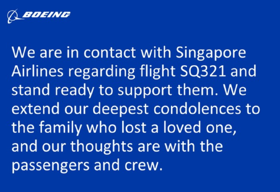 财联社5月21日电,波音公司在社交媒体表示,“我们正在与新加坡航空公司就SQ321航班进行联系,随时准备为他们提供支持”。今日下午,新加坡航空确认该公司一波音客机遭遇湍流并迫降曼谷,目前已造成2死多伤。