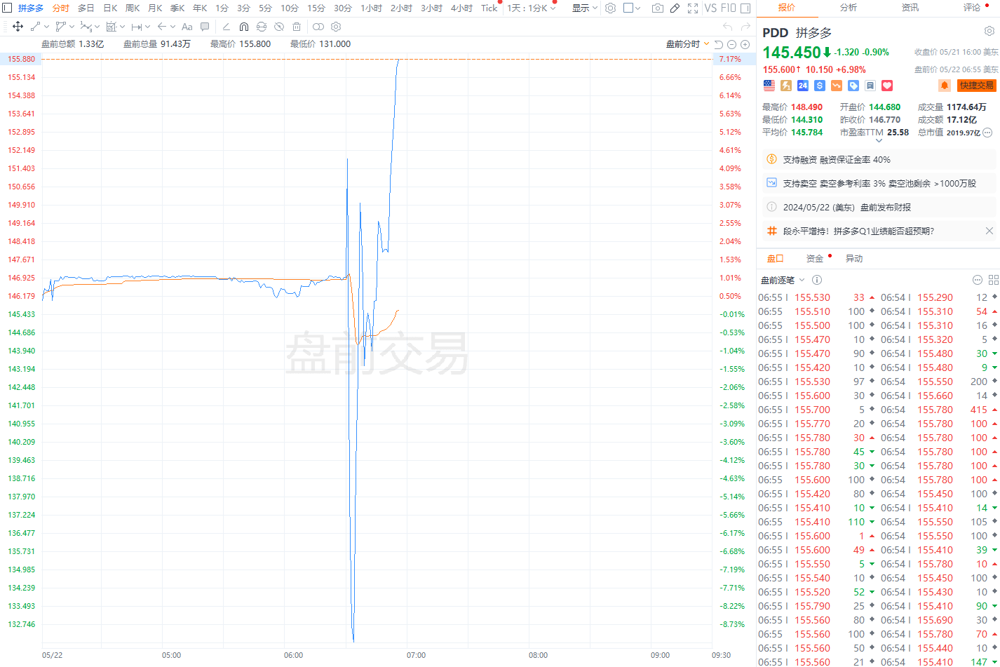 财联社5月22日电,拼多多盘前巨震后涨超7%,报155美元/股,总市值达2150亿美元超越阿里巴巴,截至上一交易日收盘,阿里巴巴总市值报2096亿美元。刚刚公布的财报显示,拼多多第一季度营收868.1亿元,市场预估768.6亿元,同比增131%;调整后净利润306.0亿元,市场预估155.3亿元,同比增202%。