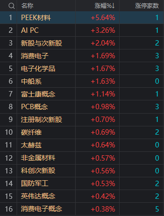 财联社5月23日电,市场早盘震荡调整,三大指数均下跌。北证50指数逆势涨超3%,所有北交所个股仅1只下跌。盘面上,军工股震荡走强,天海防务、新余国科涨超10%,长城军工涨停。电磁屏蔽概念股集体大涨,隆扬电子、方邦股份、正业科技、沃特股份等涨停。AI PC概念股持续活跃,英力股份20CM3连板。下跌方面,黄金及有色概念股集体调整,晓程科技、北方铜业等跌超5%。总体上个股跌多涨少,两市超4300只个股下跌。沪深两市半日成交额5274亿,较上个交易日放量360亿。板块方面,AI PC、次新股、军工、PCB等板块涨幅居前,贵金属、有色金属、教育、房地产等板块跌幅居前。截至收盘,沪指跌1%,深成指跌1.19%,创业板指跌0.98%。