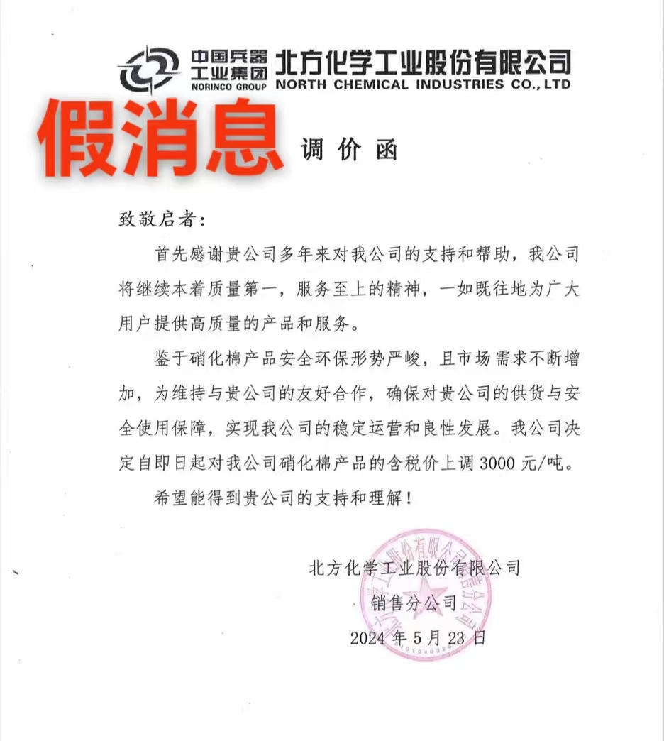 财联社5月23日电,今日,一份落款为北方化学工业股份有限公司销售分公司的硝化棉调价函引起市场关注。图片显示,鉴于硝化棉产品安全环保形势严峻,且市场需求不断增加,公司决定自即日起对硝化棉产品的含税价上调3000元/吨。财联社记者以投资者身份致电北化股份,公司证券部工作人员表示,硝化棉涨价的传闻为假消息,流出的调价函也不真实,稍后公司将在公开渠道回复此事。(财联社记者 方彦博)
