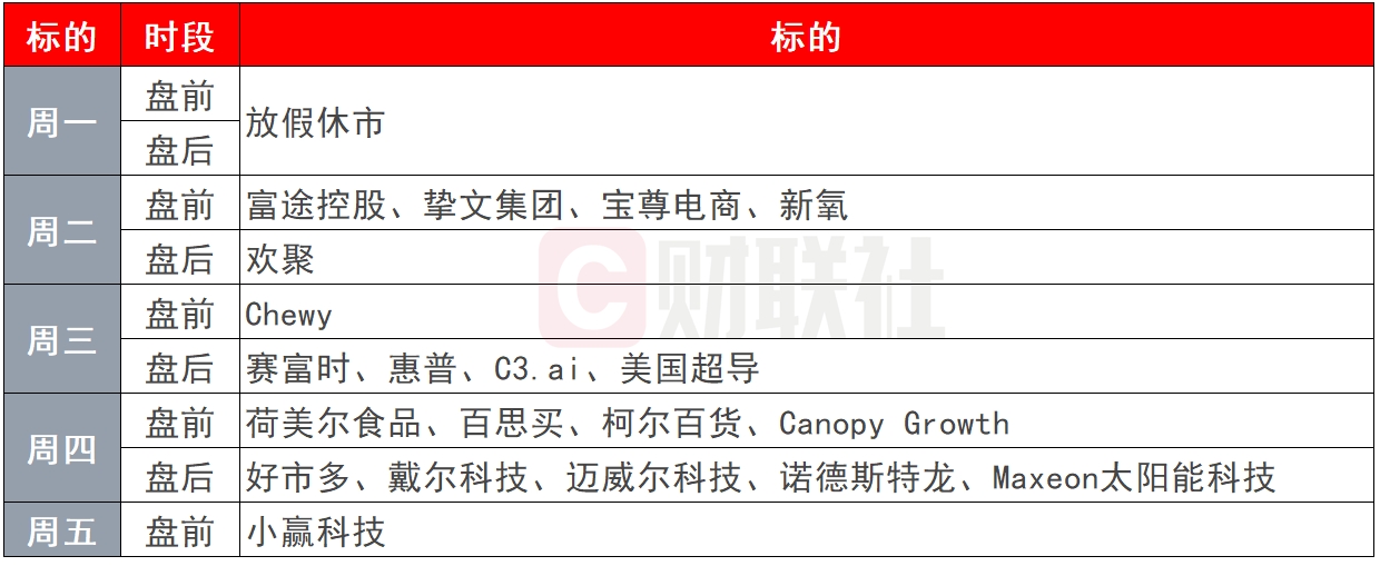 财报方面,下周有惠普、戴尔等AI PC、服务器供应商继续来讲人工智能的故事,富途控股等中概股也将发布财报。好市多等零售股则将进一步展现美国消费者的面貌。药品制造商Catalent将对诺和诺德的收购案进行表决。