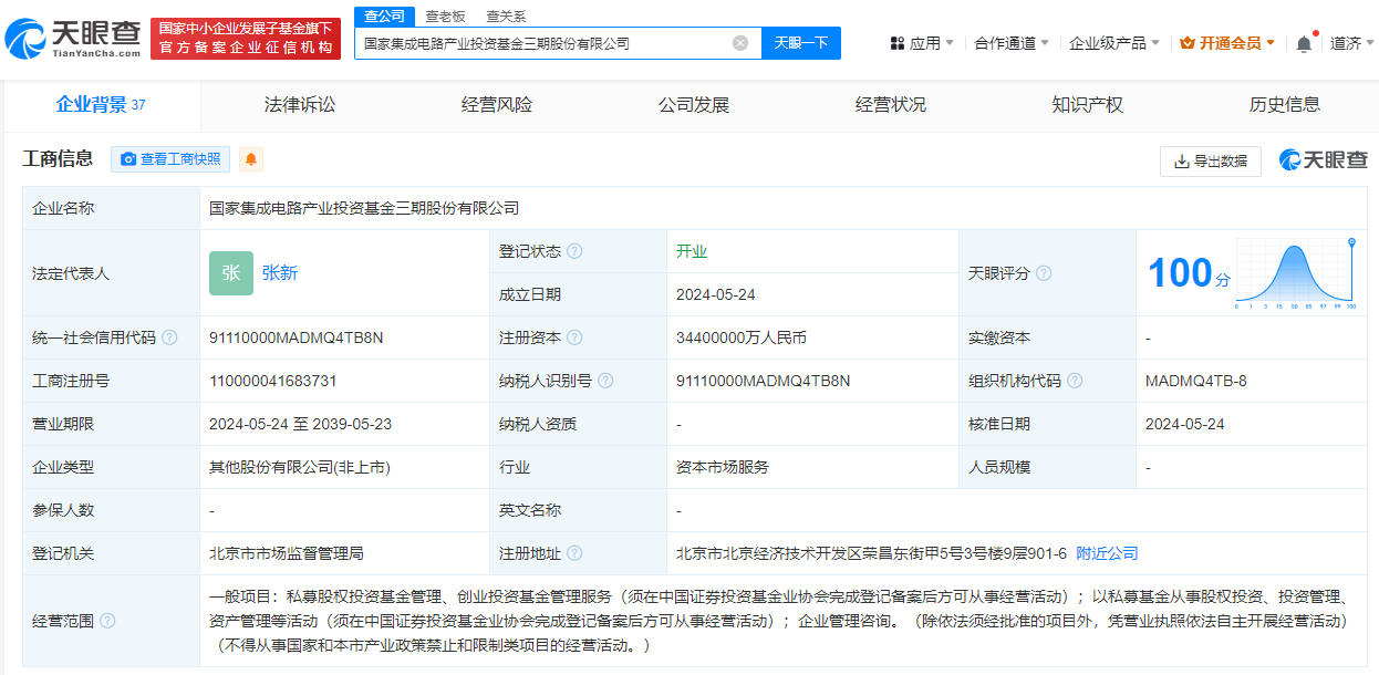财联社5月27日电,天眼查App显示,近日,国家集成电路产业投资基金三期股份有限公司成立,法定代表人为张新,注册资本3440亿人民币,经营范围为私募股权投资基金管理、创业投资基金管理服务,以私募基金从事股权投资、投资管理、资产管理等活动,企业管理咨询。股东信息显示,该公司由财政部、国开金融有限责任公司、上海国盛(集团)有限公司、中国工商银行股份有限公司、中国建设银行股份有限公司、中国农业银行股份有限公司、中国银行股份有限公司等19位股东共同持股。
