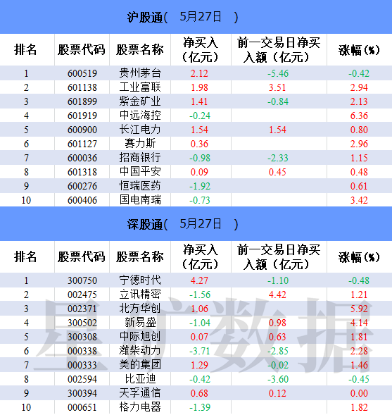 财联社5月27日电,北向资金今日净买入27.48亿元。宁德时代、贵州茅台、工业富联分别获净买入4.27亿元、2.12亿元、1.98亿元。潍柴动力净卖出额居首,金额为3.71亿元。