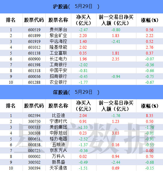 财联社5月29日电,北向资金今日净买入33.99亿元。紫金矿业、比亚迪、隆基绿能分别获净买入2.2亿元、2.04亿元、2.02亿元。格力电器净卖出额居首,金额为2.52亿元。