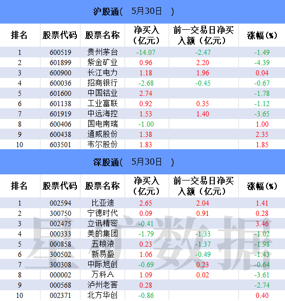 财联社5月30日电,北向资金今日净买入10.45亿元。中国铝业、比亚迪、韦尔股份分别获净买入2.74亿元、2.65亿元、1.83亿元。贵州茅台净卖出额居首,金额为14.07亿元。