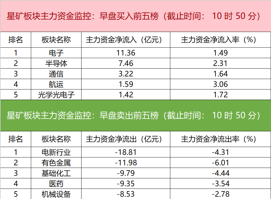 财联社6月3日电,财联社星矿数据显示,今日早盘主力资金净流入电子、半导体、通信等板块,净流出电新行业、有色金属、基础化工等板块,其中电新行业净流出超18亿元。个股方面,万润科技涨停,主力资金净买入2.27亿元位居首位,工业富联、新易盛、沪电股份获主力资金净流入居前;天银机电遭净卖出超2亿元,盛屯矿业、长安汽车、北汽蓝谷主力资金净流出额居前。