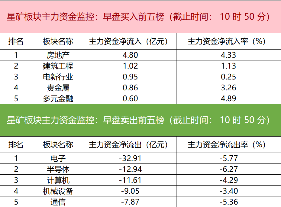 财联社6月4日电,财联社星矿数据显示,今日早盘主力资金净流入房地产、建筑工程、电新行业等板块,净流出电子、半导体、计算机等板块,其中电子板块净流出超32亿元。个股方面,亿纬锂能大涨,主力资金净买入2.00亿元位居首位,供销大集、万集科技、宗申动力获主力资金净流入居前;通富微电遭净卖出超1亿元,中国海油、中国神华、斯菱股份主力资金净流出额居前。