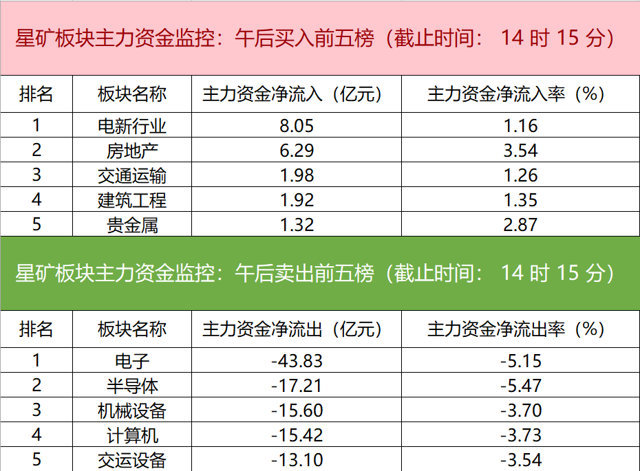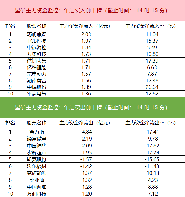 财联社6月4日电,财联社星矿数据显示,今日主力资金净流入电新行业、房地产、交通运输等板块,净流出电子、半导体、机械设备等板块,其中电子板块净流出43.83亿元。个股方面,药明康德上涨,主力资金净买入2.03亿元居首位,TCL科技、中远海控、万集科技获主力资金净流入居前;赛力斯遭净卖出4.84亿元居净流出首位,通富微电、中国神华、永辉超市等主力资金净流出额居前。