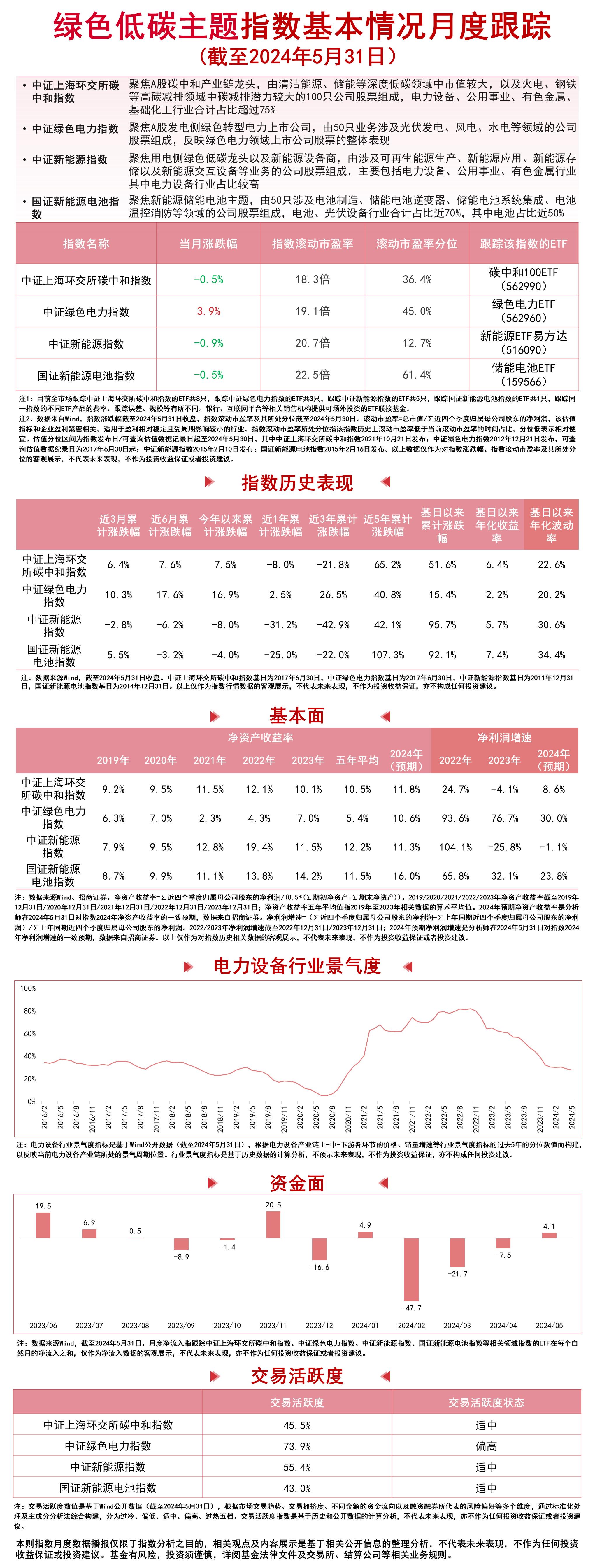 财联社6月5日电,5月,中证上海环交所碳中和指数下跌0.5%,中证绿色电力指数上涨3.9%,中证新能源指数下跌0.9%,国证新能源电池指数下跌0.5%。5月末,国务院印发《2024—2025年节能降碳行动方案》提出,要加大非化石能源开发力度。加快建设以沙漠、戈壁、荒漠为重点的大型风电光伏基地。到2025年底,全国非化石能源发电量占比达到39%左右。中信建投证券认为,《方案》的出台,有助于提升用能单位的非化石能源消费意愿,加速绿电环境价值的兑现,增强新能源运营商的盈利能力。