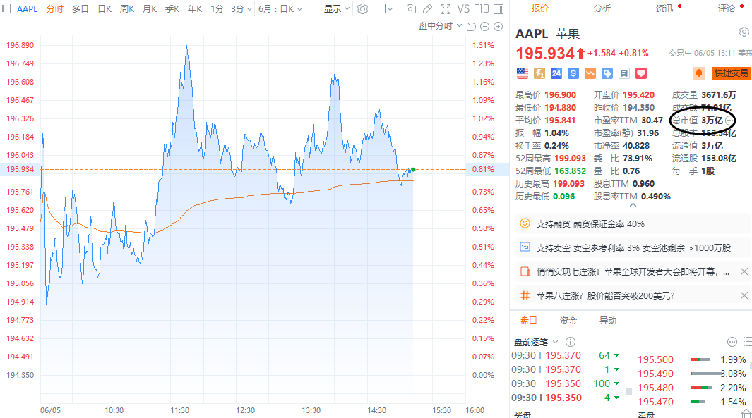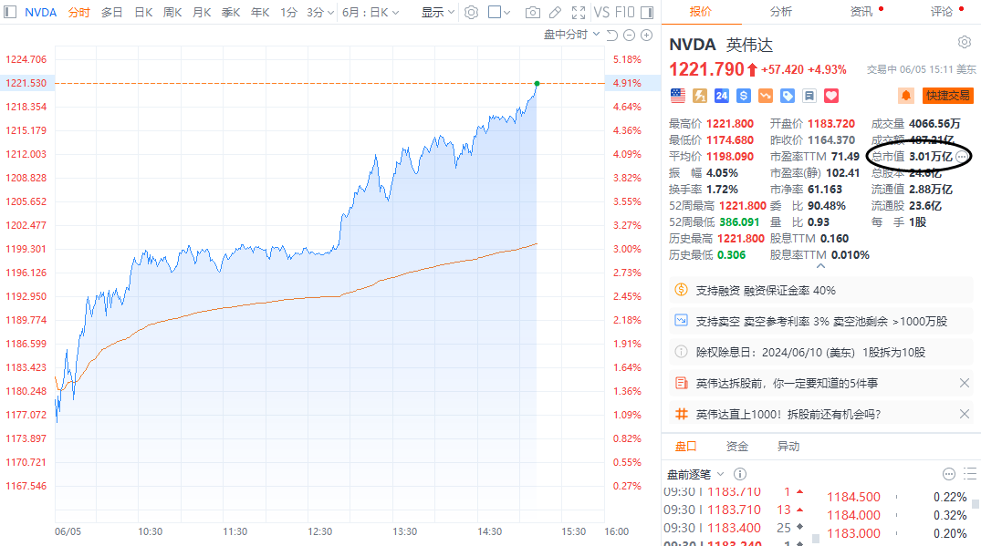 财联社6月6日电,英伟达日内涨幅近5%,总市值达3.01万亿美元,超苹果公司的3万亿美元,仅次于微软。英伟达年内累计涨幅近150%。