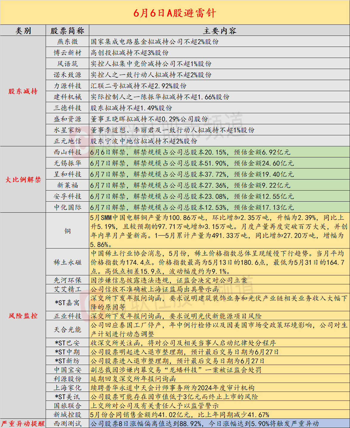 昨日公告的A股拟减持的公司数量较之前有所增多,燕东微股东国家集成电路基金拟减持公司不超2%股份,博云新材股东高创投拟减持不超3%股份;无锡振华、呈和科技将迎来超三成以上解禁;5月国内电解铜产量大幅增加,月度产量再度突破百万大关;先河环保因涉嫌信息披露违法违规,证监会决定对公司立案;中国稀土行业协会表示,5月份稀土价格指数总体呈现缓慢下行趋势;艾艾精工因公司信披不准确被上海证监局出具警示函;普京称西方国家参与对俄军事打击意味着对俄直接开战。