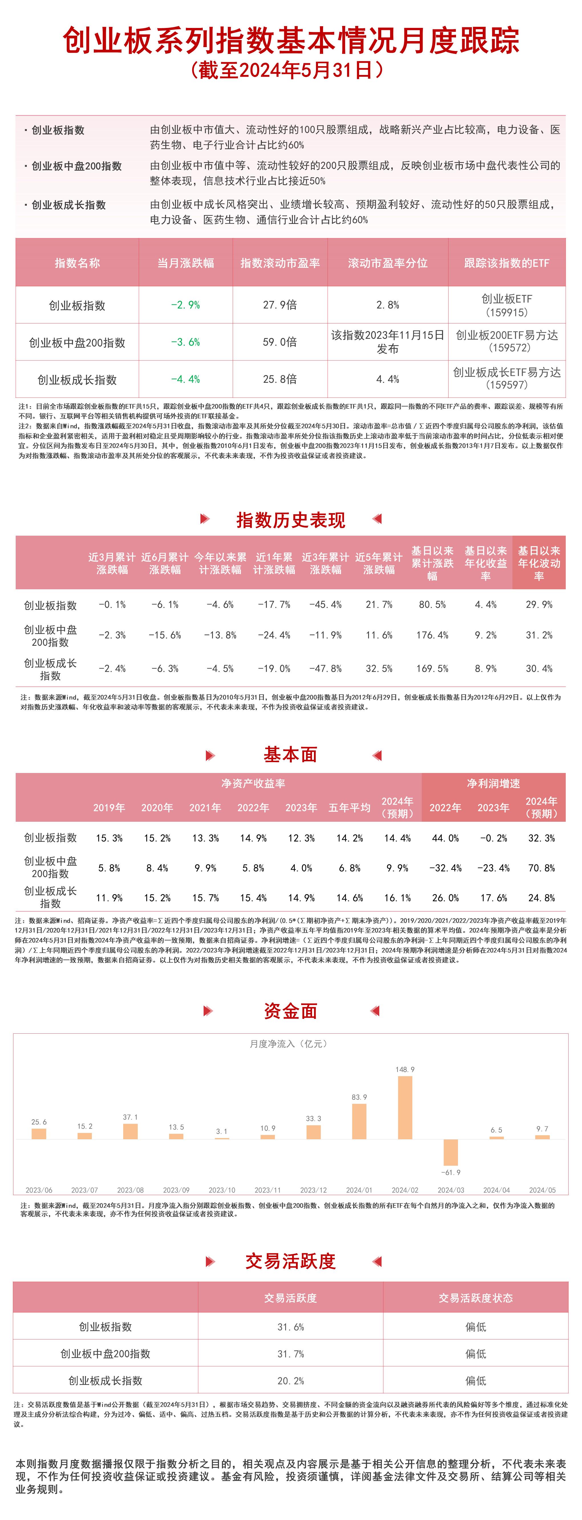 5月,创业板指数下跌2.9%,创业板中盘200指数下跌3.6%,创业板成长指数下跌4.4%。