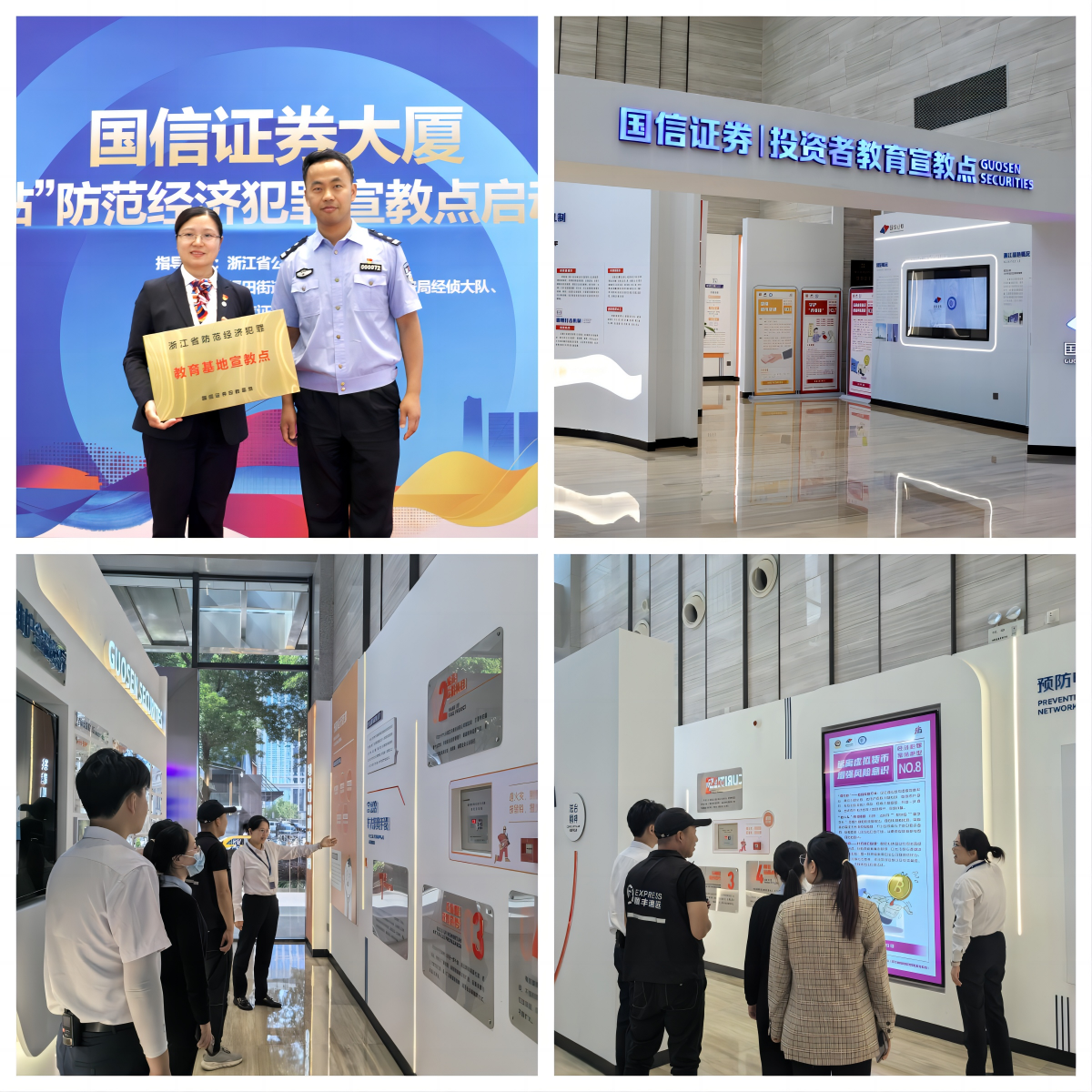在金华义乌国信证券大厦,浙江省防范经济犯罪教育基地义乌宣教点正式揭牌启动,浙江省公安厅经侦总队负责人为宣教点进行授牌。该宣教点是国信证券投教基地在浙江省公安厅的指导下打造的集防范经济犯罪、防范电信网络诈骗、金融知识普及和安全知识教育于一体的综合性、沉浸式宣传阵地,未来将积极开展防范经济犯罪宣传活动,将宣传触角延伸至群众身边,营造社会共同参与、全民共同防范的良好氛围。