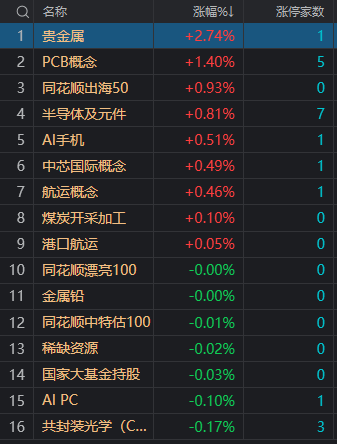 财联社6月6日电,市场早盘冲高回落,三大指数均小幅下跌。大小指数明显分化,微盘股指数跌近6%。盘面上,PCB概念股逆势大涨,明阳电路、金百泽、协和电子、中京电子等涨停。航运股震荡走强,九丰能源涨停,中远海特涨超5%。贵金属概念股展开反弹,玉龙股份涨停,晓程科技涨超5%。电力股盘中异动,深南电A涨停。下跌方面,车路云概念股集体调整,安车检测等多股跌超10%。总体上个股跌多涨少,全市场超4600只个股下跌。沪深两市半日成交额5380亿,较上个交易日放量1073亿。板块方面,贵金属、PCB、AI手机、航运等板块涨幅居前,电商、新型城镇化、教育、车路云等板块跌幅居前。截至收盘,沪指跌0.08%,深成指跌0.12%,创业板指跌0.17%。