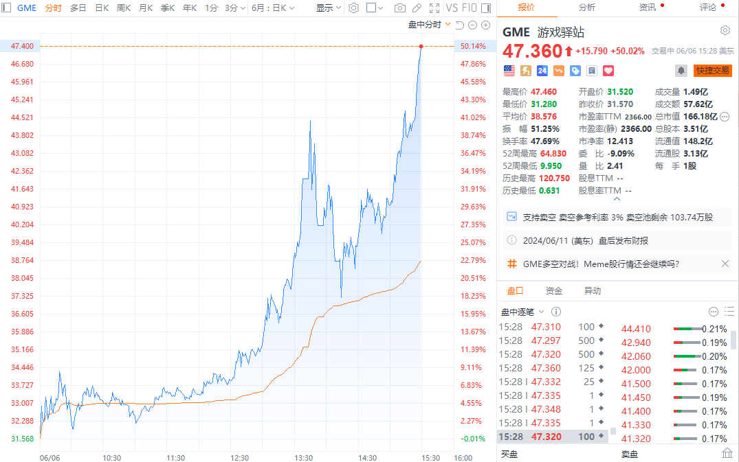 财联社6月7日电,游戏驿站日内涨幅扩大至50%,报47.36美元/股。“咆哮小猫”称将在youtube进行直播。
