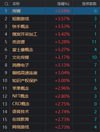 财联社6月12日电,市场全天震荡分化,沪指反弹,创业板指调整。大小指数走势分化,小盘股继续活跃。盘面上,AI应用方向展开反弹,传媒、短剧概念股集体走强,荣信文化、思美传媒、浙版传媒、龙版传媒涨停。苹果概念股开盘大涨,智信精密、杰美特、瀛通通讯、领益智造涨停。煤炭股午后走强,大有能源涨停,陕西煤业再创历史新高。CRO概念股盘中冲高,万邦医药涨超10%,药明康德涨超5%。PCB概念股持续活跃,协和电子7连板,骏亚科技、宏昌电子涨停。总体上个股涨多跌少,全市场超3900只个股上涨。沪深两市今日成交额6920亿,较上个交易日缩量109亿。板块方面,传媒、煤炭、苹果概念、CRO等板块涨幅居前,养鸡、银行、港口等板块跌幅居前。截至收盘,沪指涨0.31%,深成指涨0.08%,创业板指跌0.44%。