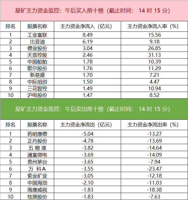 财联社6月13日电,财联社星矿数据显示,今日主力资金净流入半导体、汽车整车、电子等板块,净流出医药、有色金属、基础化工等板块,其中医药板块净流出20.59亿元。个股方面,工业富联大涨,主力资金净买入8.49亿元居首位,比亚迪、德业股份、天音控股获主力资金净流入居前;药明康德遭净卖出5.04亿元居净流出首位,正丹股份、五粮液、通富微电等主力资金净流出额居前。