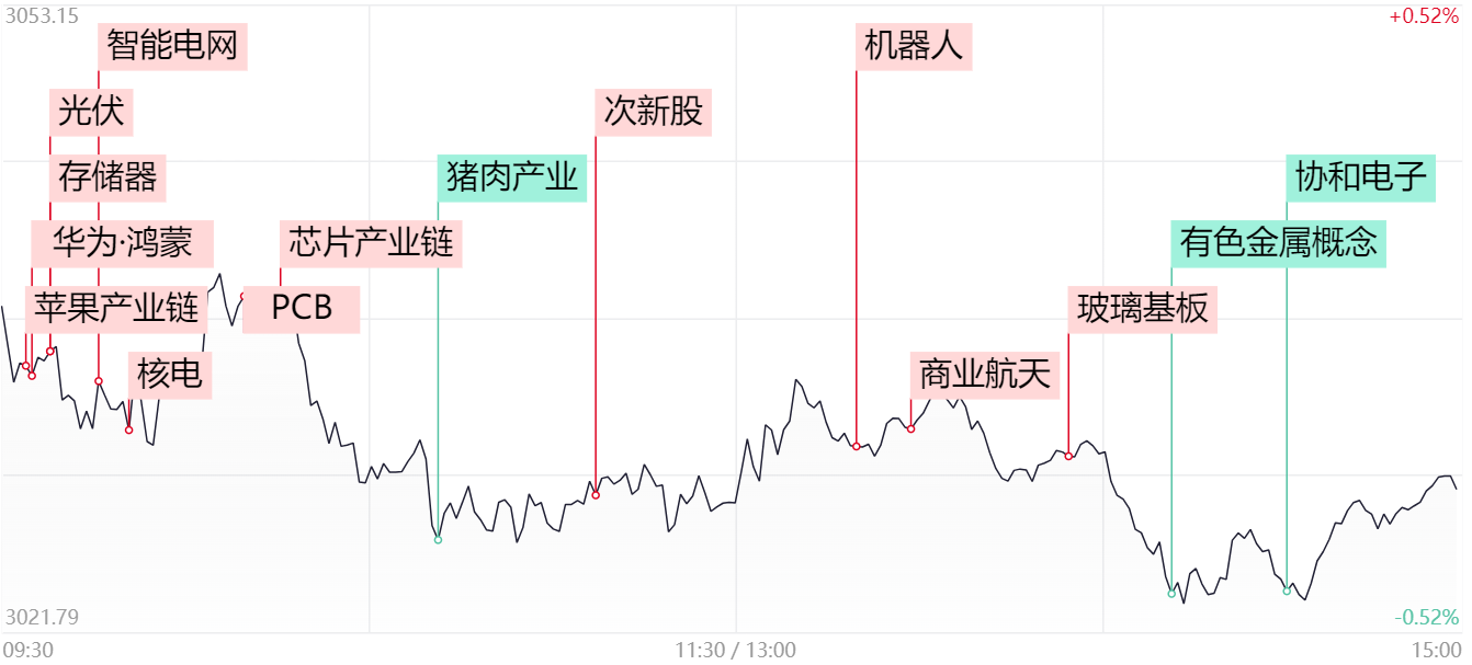 财联社6月14日电,市场全天震荡调整,三大指数均小幅下跌。总体上个股跌多涨少,全市场超3400只个股下跌。沪深两市成交额7525亿,较前日放量605亿。1)苹果与英伟达、微软、谷歌均续创历史新高。苹果产业链延续涨势,杰美特、瀛通通讯继续实现连板晋级。此外,服务器龙头工业富联,光模块龙头新易盛再度逼近前期高点。2)芯片半导体产业链在连续高潮后,内部出现剧烈分化,安路科技等众多科创板次新芯片股大面积拉升,而台基股份、捷捷微电、容大感光等前期热门品种降温。3)特斯拉将于当地时间6月13日召开2024年股东大会,市场对于股东大会上发布相关技术全新进展较为期待,使得人形机器人概念股仍表现出一定强势,叠加次新属性的斯菱股份涨停,步科股份、北特科技、力星股份等品种盘中不同程度上涨。4)近日,我国多地出现持续性高温天气,导致用电负荷不断攀升,随着多个清洁能源发电项目落地,新能源消纳能力对电网形成严峻考验。电网、虚拟电厂以及光伏等新能源赛道展开资金积极回流动作,逆变器龙头德业股份涨停,北京科锐、伊戈尔、许继电气等电网设备股也盘中纷纷逆势展开拉升。