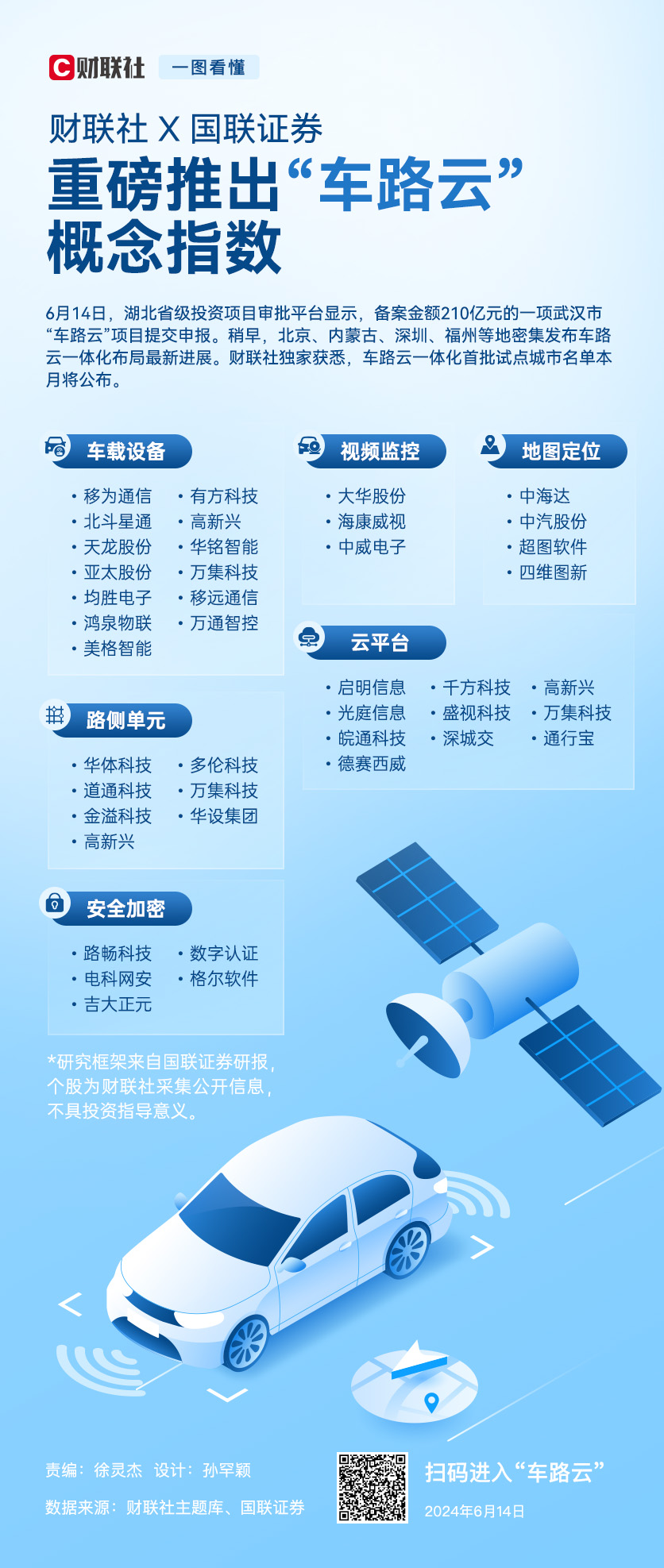 财联社6月14日电,“车路云”试点消息持续发酵。湖北省投资项目在线审批监管平台最新显示:武汉“车路云”一体化重大示范项目已获市发改委批准,备案金额为170亿(与稍早申报金额210亿有不同),6月份开工。财联社主题库携手国联证券今日推出“车路云”板块指数,为投资者提供专业财经信息服务,板块覆盖车载设备、路侧单元、地图定位、云平台、安全加密、视频监控等六大细分产业链,进行持续更新。