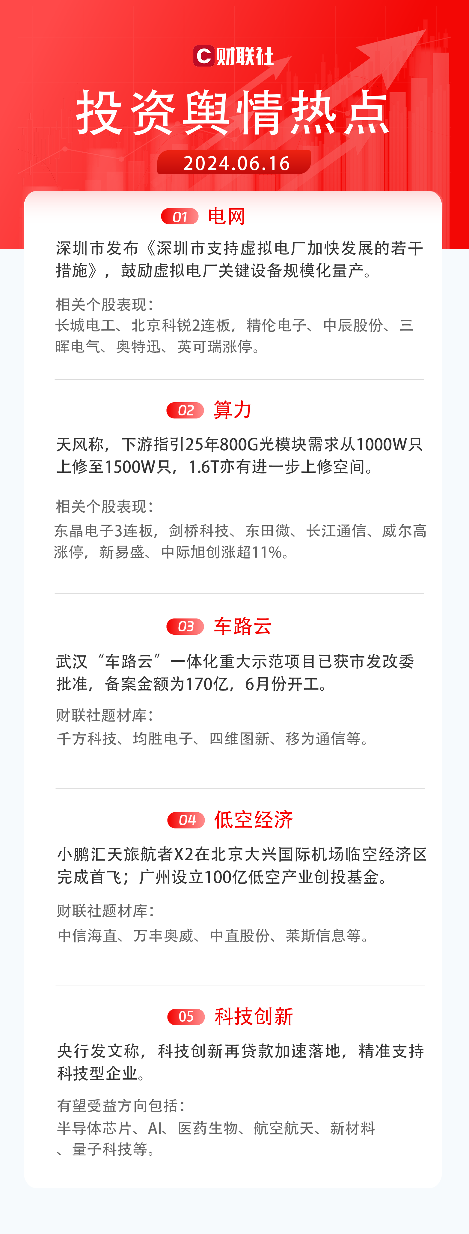 5)科技创新:央行发文称,科技创新再贷款加速落地,精准支持科技型企业。