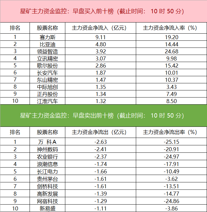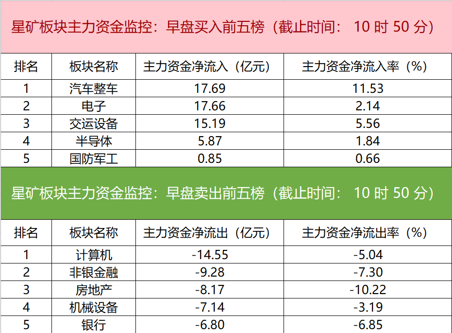 财联社6月17日电,财联社星矿数据显示,今日早盘主力资金净流入汽车整车、电子、交运设备等板块,净流出计算机、非银金融、房地产等板块,其中汽车整车板块净流入超17亿元。个股方面,赛力斯大涨,主力资金净买入9.11亿元位居首位,比亚迪、领益智造、立讯精密获主力资金净流入居前;万科A遭净卖出超2亿元,神州数码、农业银行、浪潮信息主力资金净流出额居前。